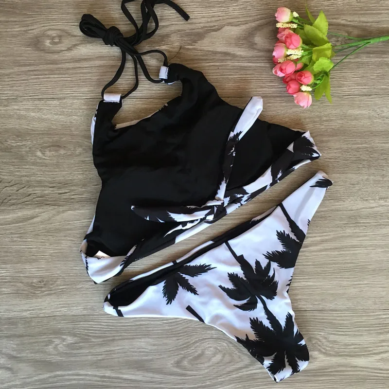 Print Floral Palm Tree Bikini Set Halter Crop Top Hang High Neck Bikinis Set Push Up Swimwear Women