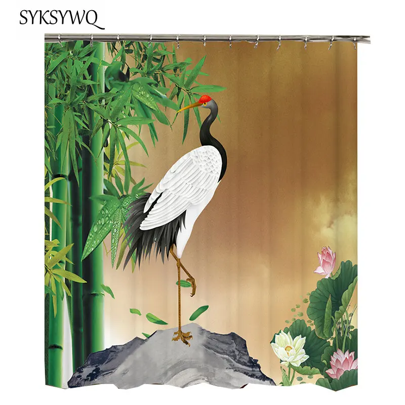 HIGH QUALITY bamboo Crane shower curtain lotus bath curtain shower douchegordijn ringen bathroom curtain
