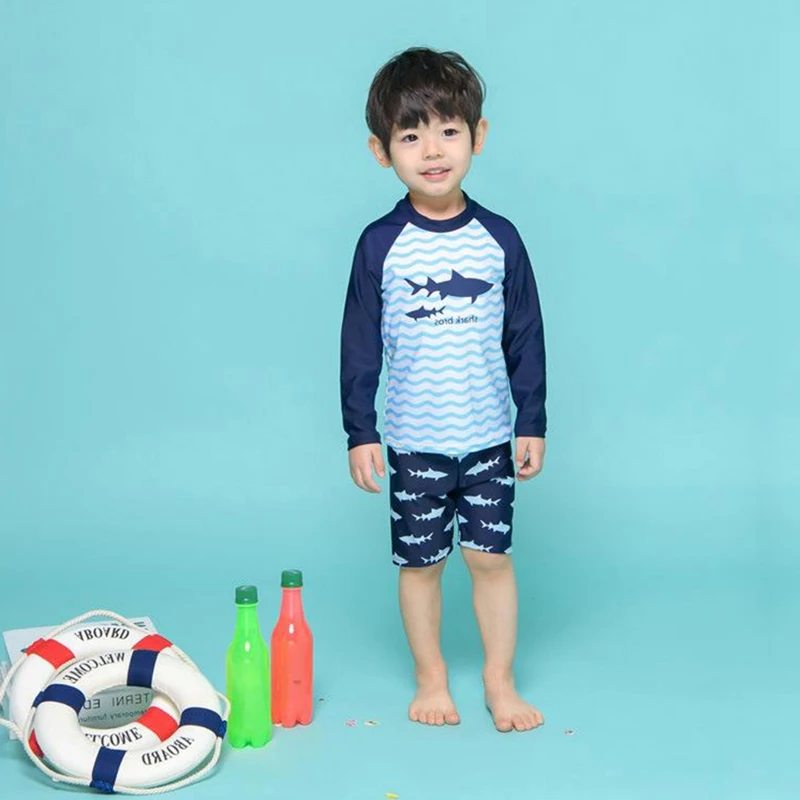 Hot Sale Boy Rash Guard Swimming Cap Kit Swimwear Children Kids Long Sleeve Shirt Shorts Printed Sunshade Be
